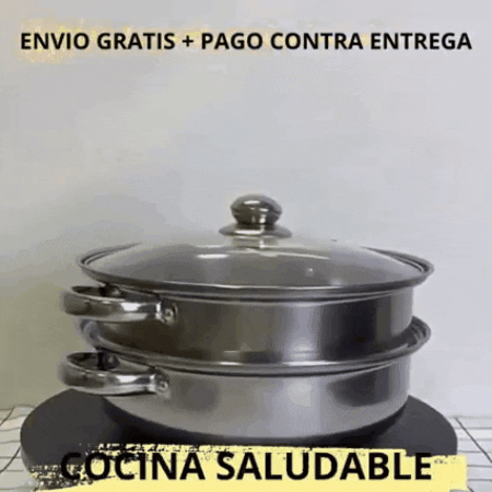 OLLA Y VAPORERA DE ALIMENTOS EN ACERO INOXIDABLE CON TAPA DE VIDRIO