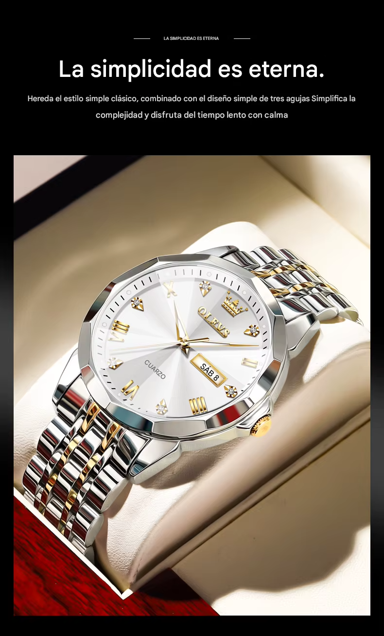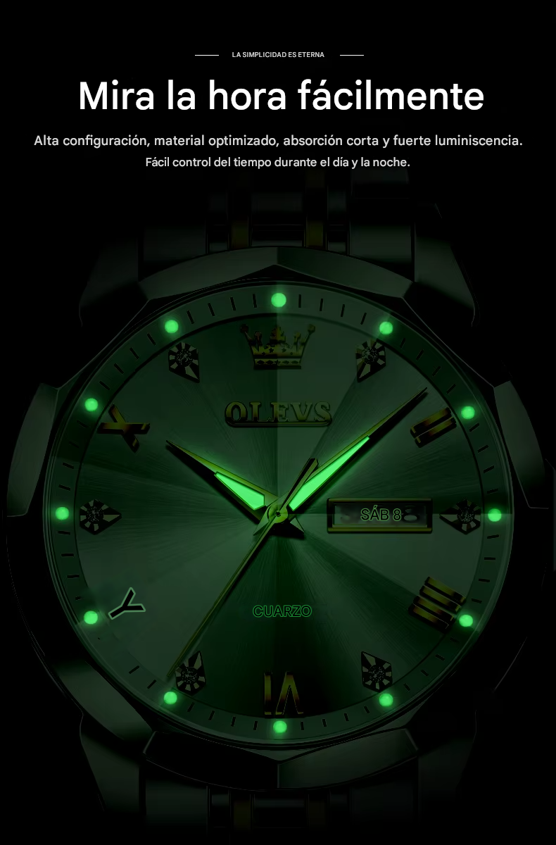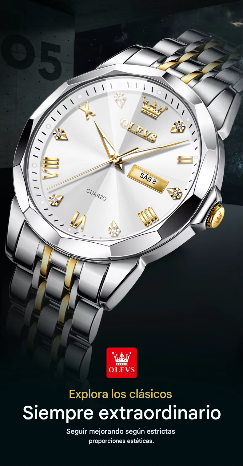 Este reloj está diseñado pensando en los hombres que exigen lo mejor. Su movimiento de cuarzo estable garantiza precisión, mientras que el cristal de alta dureza lo hace resistente a arañazos, desgaste y hasta el agua.
