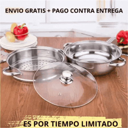 OLLA Y VAPORERA DE ALIMENTOS EN ACERO INOXIDABLE CON TAPA DE VIDRIO