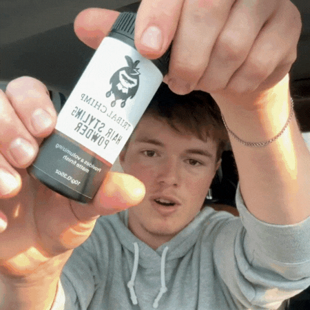 Paso 1: Espolvorea una pequeña cantidad de Tribal Chimp Hair Styling Powder directamente sobre tu cabello.